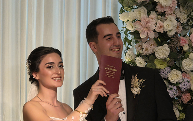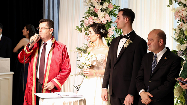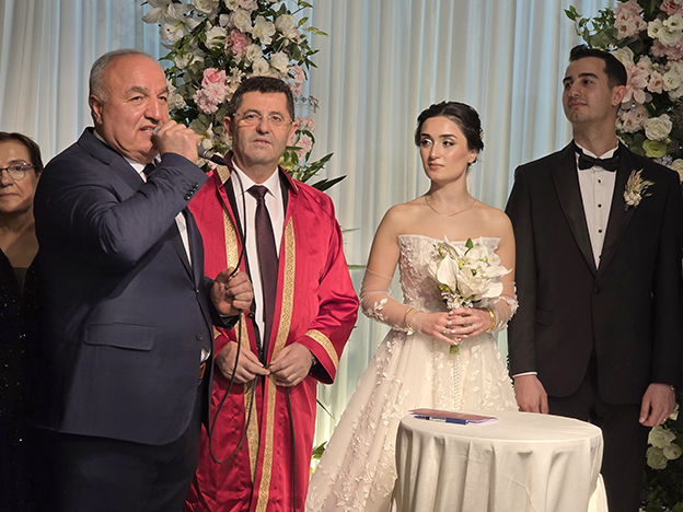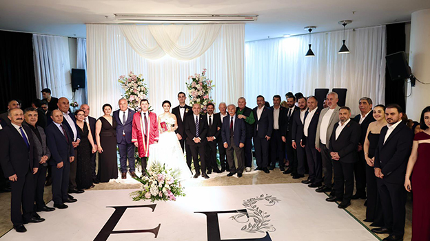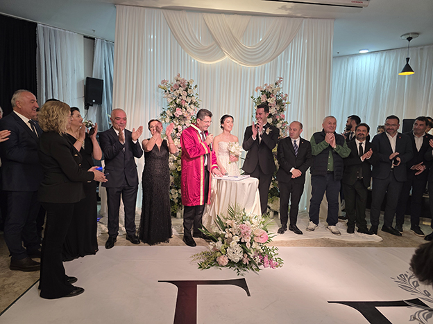 Emrehan ve Eda çiftinin evlilik cüzdanını takdim eden CHP Genel Başkan Yardımcısı Özgür Karabat da Genel Başkan Özgür Özel’in selamlarını getirdiğini ifade ederek Arslan ve Serin ailelerine hayırlı ve uğurlu olsun dileklerini iletti.