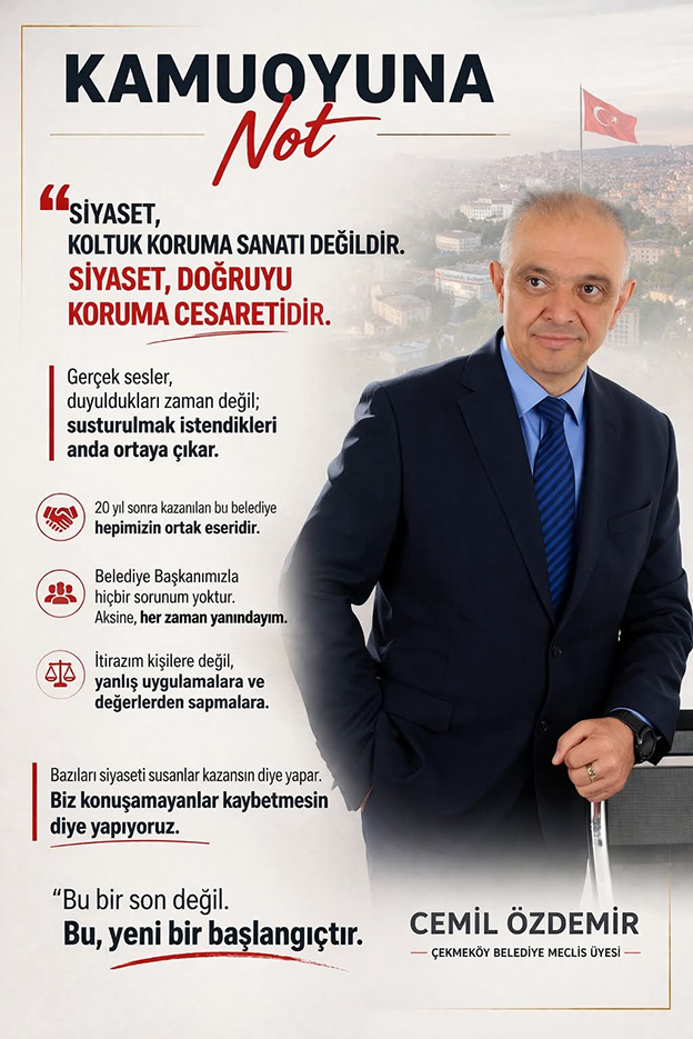Çekmeköy Belediyesi’nin CHP’den istifa eden bağımsız meclis üyesi Cemil Özdemir, “kamuoyuna not” başlığıyla sosyal medyasından yaptığı paylaşımının ardından yerel basına ilettiği istifasının ardındaki ikinci açıklamasında şunları kaydetti: “31 Mart 2024’te Çekmeköy’de yaklaşık 20 yıl sonra kazanılan belediye, bu kentin demokrasi hafızasında önemli bir kırılma noktasıdır. Bu başarı; bir kişinin, bir grubun ya da dar bir çevrenin değil, değişim isteyen halkın ortak iradesidir. Bu iradeye gölge düşmemesi için, görev yaptığım süre boyunca hem partime, hem örgütüme hem de Sayın Belediye Başkanımıza sahip çıkmayı bir sorumluluk olarak gördüm.