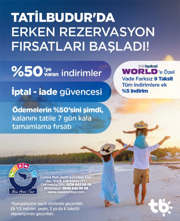Misafirlerine kaliteli ve keyifli tatil deneyimlerine aracılık eden TatilBudur’da erken rezervasyon dönemi başladı. Türkiye’nin en sevilen rotalarında yüzde 50’ye varan indirimler, 9 taksit imkanları, “yüzde 50’sini şimdi öde, kalanını tatile 7 gün kala öde” kampanyası tatil tutkunlarını bekliyor. TatilBudur Çekmeköy Acentesi newarentour.com Genel Koordinatörü Menduf Sağdıç, şu bilgileri paylaştı: